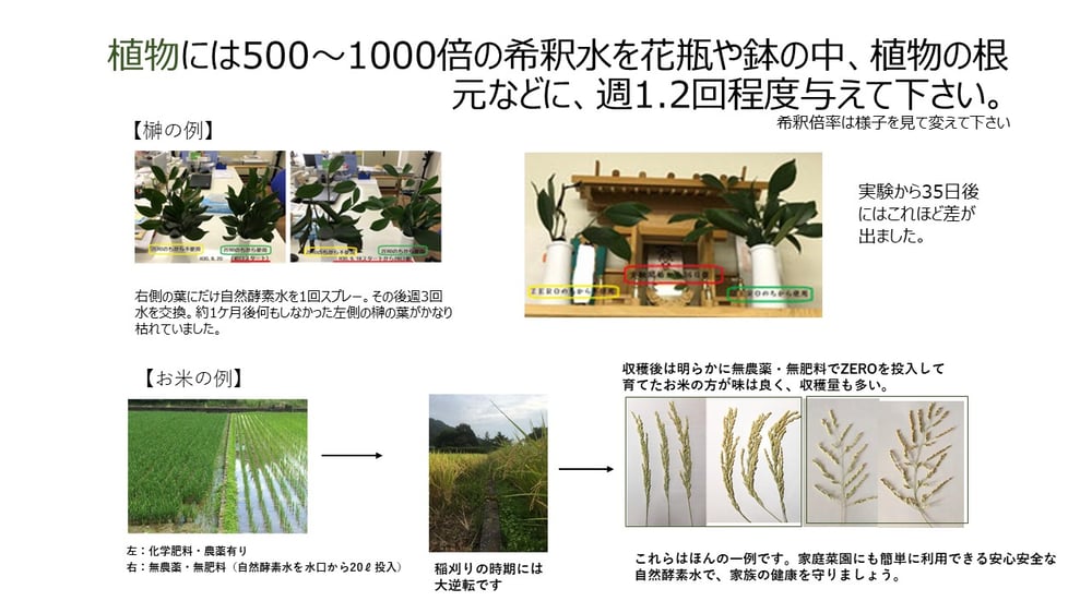 植物の活性化、水の浄化、魚の活性化、グリーストラップの浄化、生活臭の消臭、洗濯やお掃除、ペットのケア、動物の活性化、農家家庭菜園。