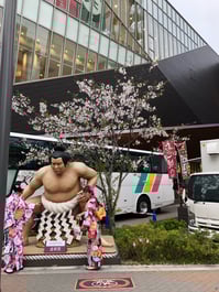 海外の方が着物を着てお相撲さんと桜を背景に写真撮影されていました。